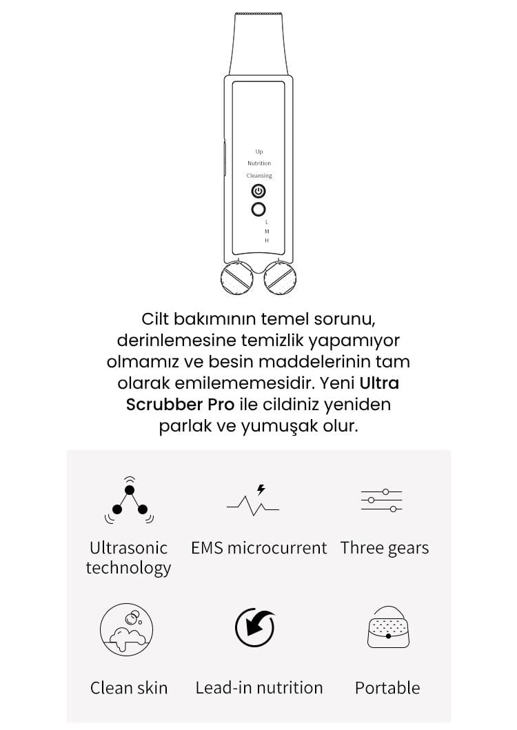 Ultra Scrubber Pro, ev konforunda klinik düzeyde cilt bakımı sunmak üzere geliştirilmiş şarj edilebilir ultrasonik cilt temizleyici ve EMS mikro akım teknolojilerini bir arada barındıran yenilikçi bir cihazdır. Yüzünüzde biriken makyaj kalıntıları, ölü deri hücreleri, siyah noktalar ve fazla yağın yanı sıra ince kırışıklıklar ve sarkmalarla da etkili bir mücadele sağlar. Ergonomik tasarımı, tek tuşla kolay kullanım imkânı ve taşınabilir yapısıyla hem evde hem seyahatlerinizde yanınızdan ayırmayacağınız bir güzellik asistanına dönüşür.