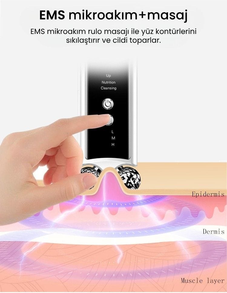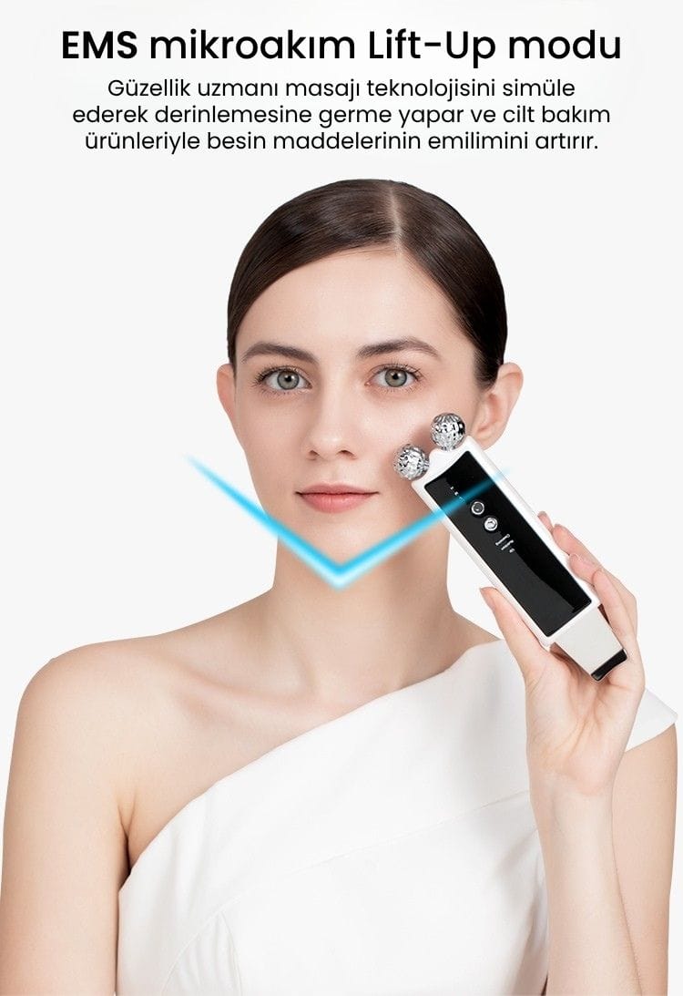 - EMS Mikro Akım: Cilt altındaki dermis tabakasına küçük elektriksel uyarılar göndererek fibroblast hücrelerini aktive eder. Bu sayede kolajen ve elastin üretimini destekleyerek lifting etkisi yaratır. Düzenli kullanımda cilt dokusu güçlenir, ince kırışıklıklar belirgin şekilde azalır.